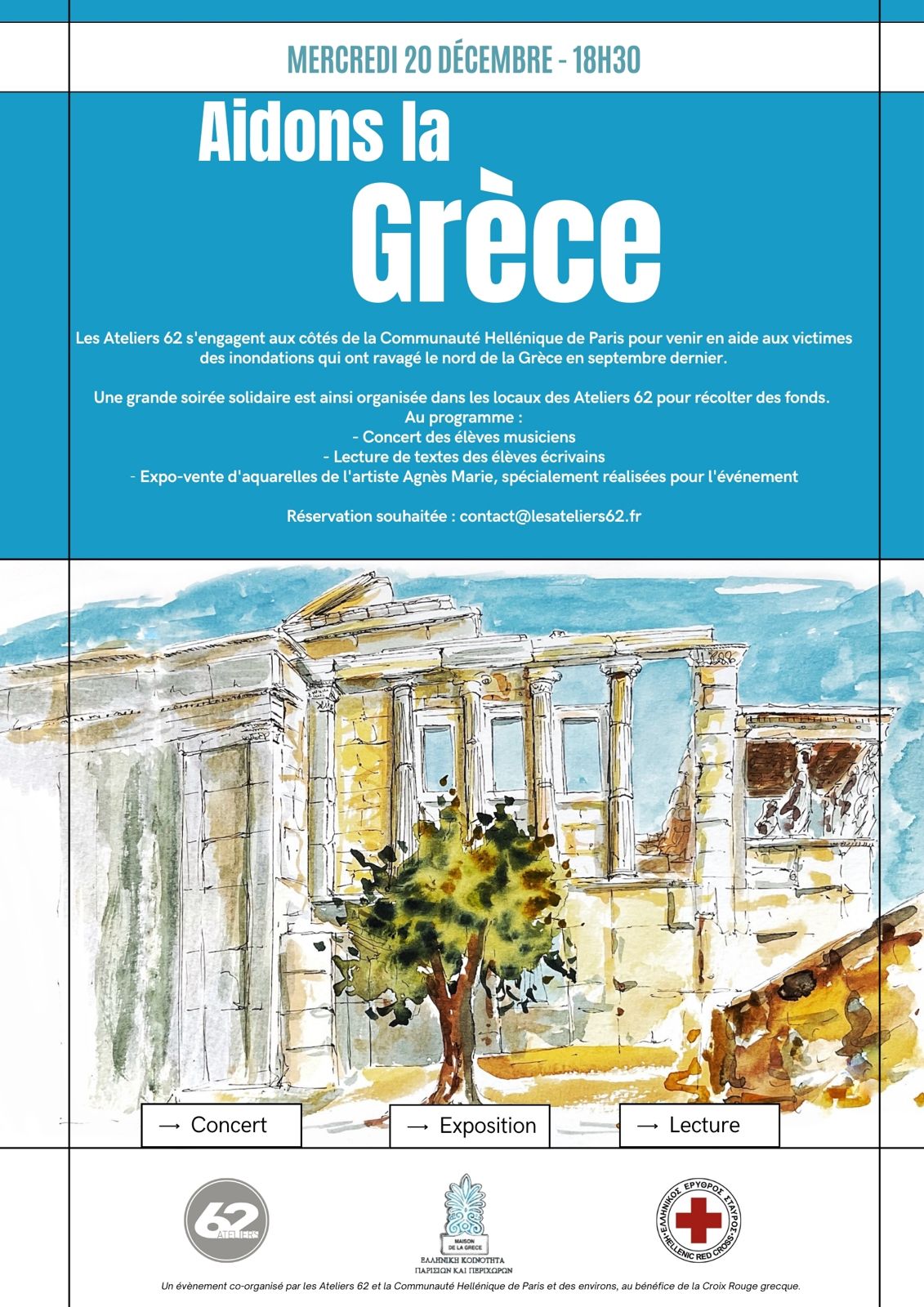 Afin de recueillir des fonds pour les victimes des inondations en Thessalie, les Ateliers 62 organisent une soirée caritative le 20/12. J’y expose des aquarelles réalisées pour l’occasion.