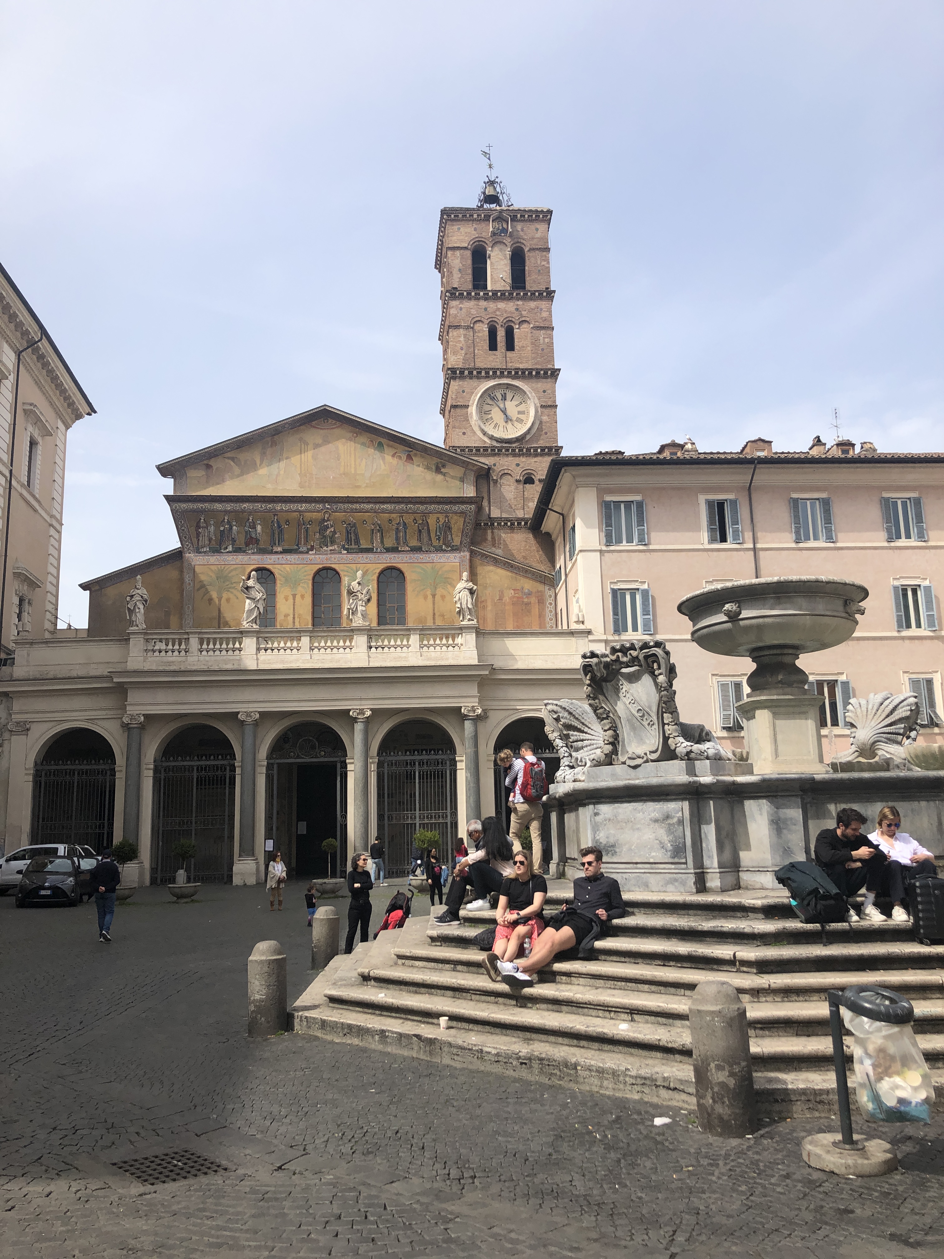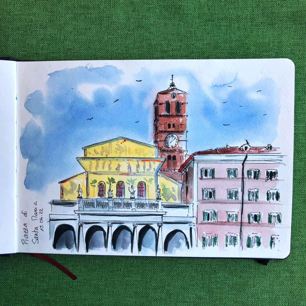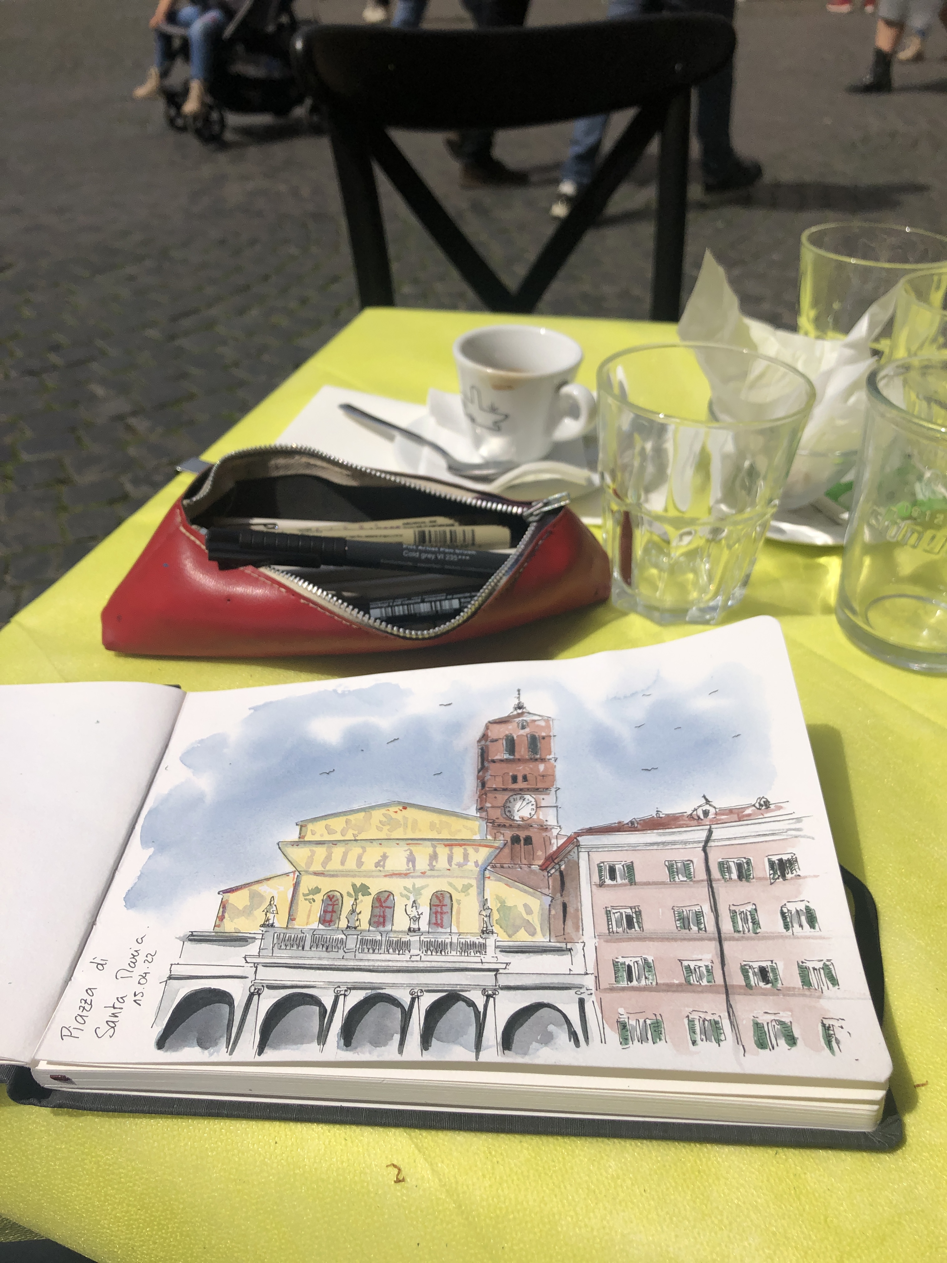 Premier arrêt dessin sur la place Santa Maria dans le quartier de Trastevere, devant la Basilique Santa Maria, une des plus vieilles églises de la ville, construite entre 217-222.