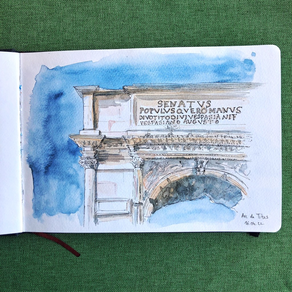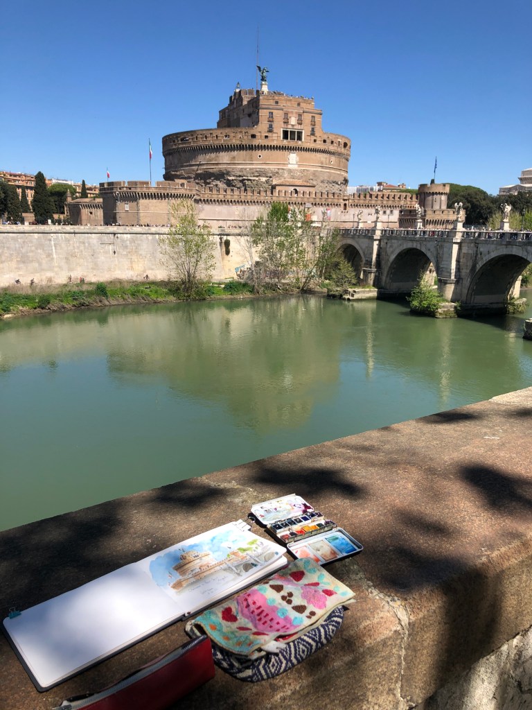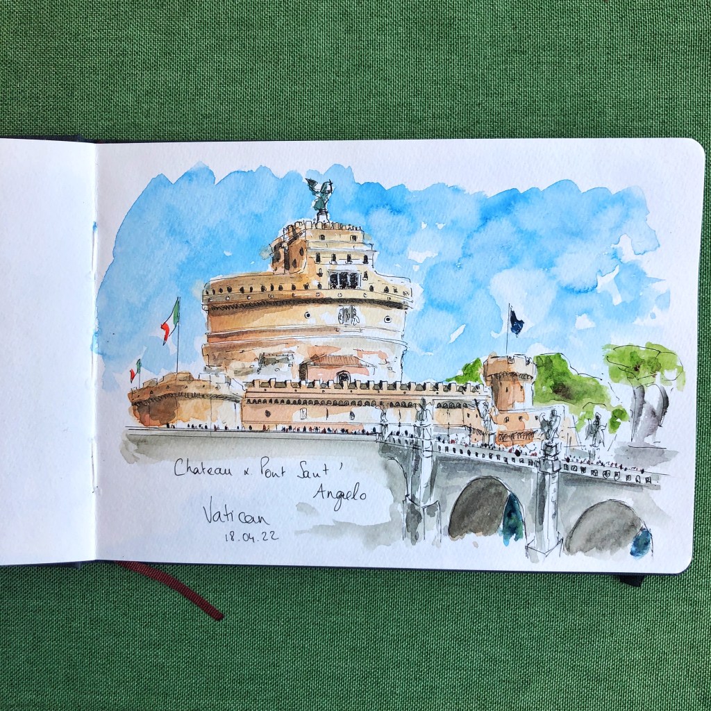 Visite de la place d’Espagne au nord de la ville et des jardins de la villa Borghèse. Retour au Vatican pour un bain de foule de touristes, et petite pause sur le quai du fleuve Tibre pour dessiner le Château de Sant’ Angelo.