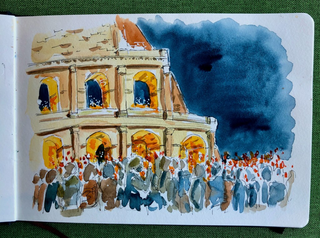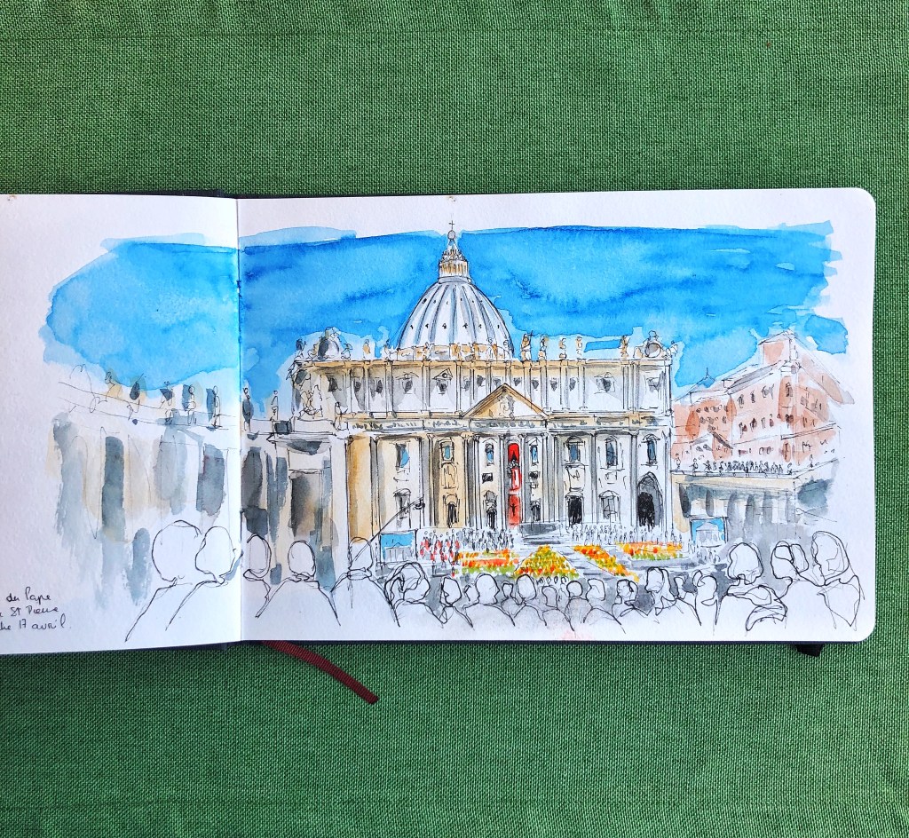 En route pour le Vatican pour la messe de Pâques ! Nous ne sommes pas croyants, mais nous sommes très curieux de voir cet événement. Nous ne sommes pas déçus, la foule est en délire quand le Pape s’y promène dans sa papamobile. La messe dure longtemps, très longtemps et j’en profite pour croquer le panorama devant moi.