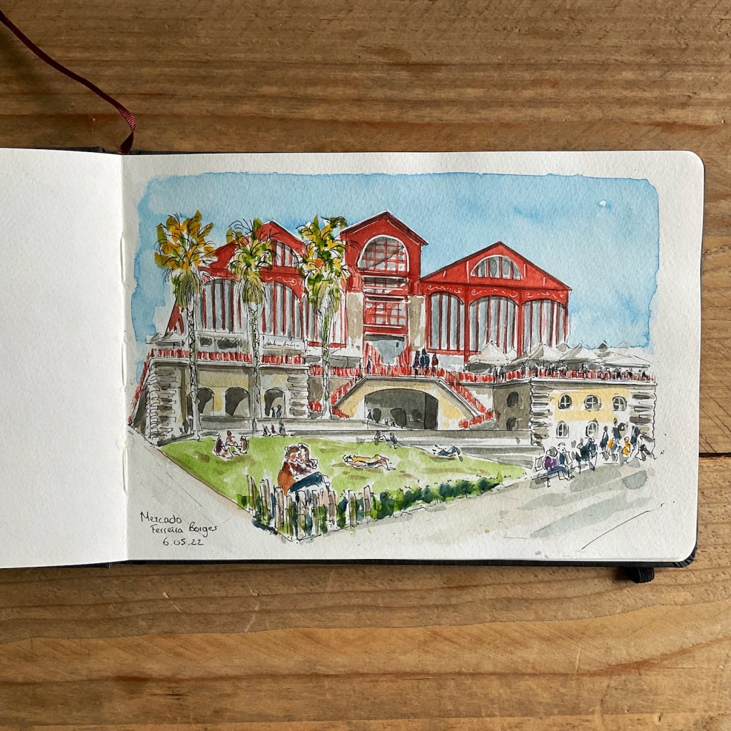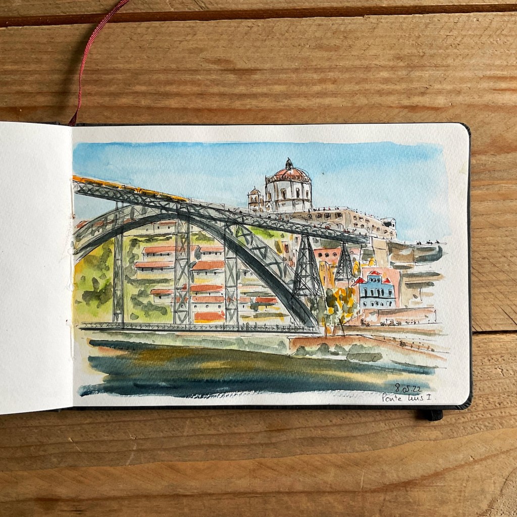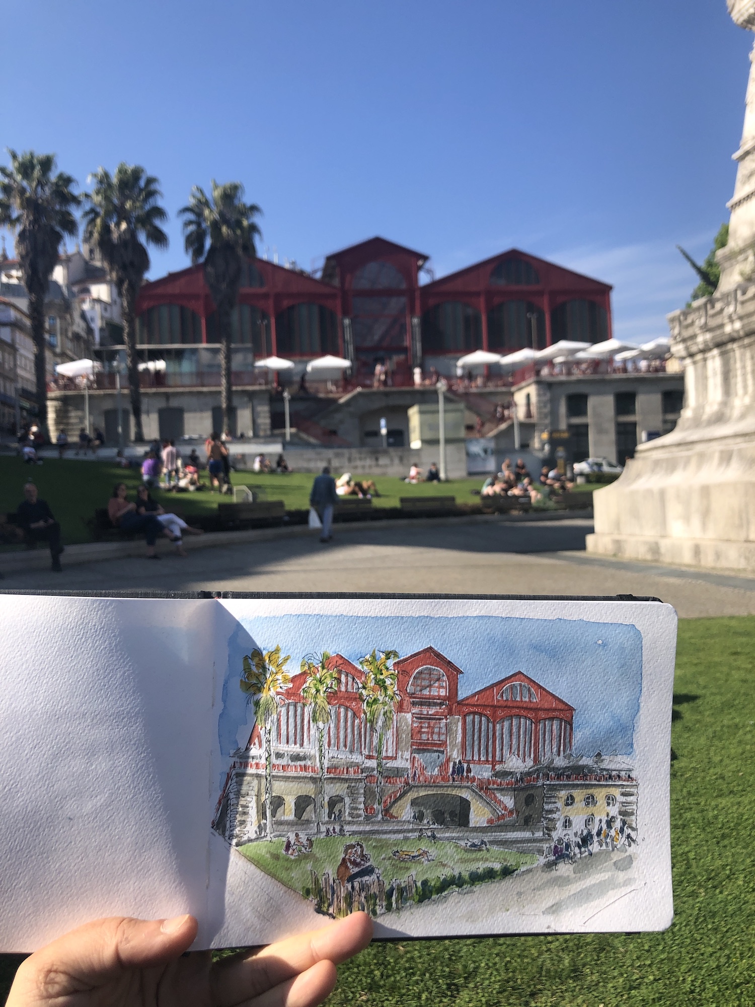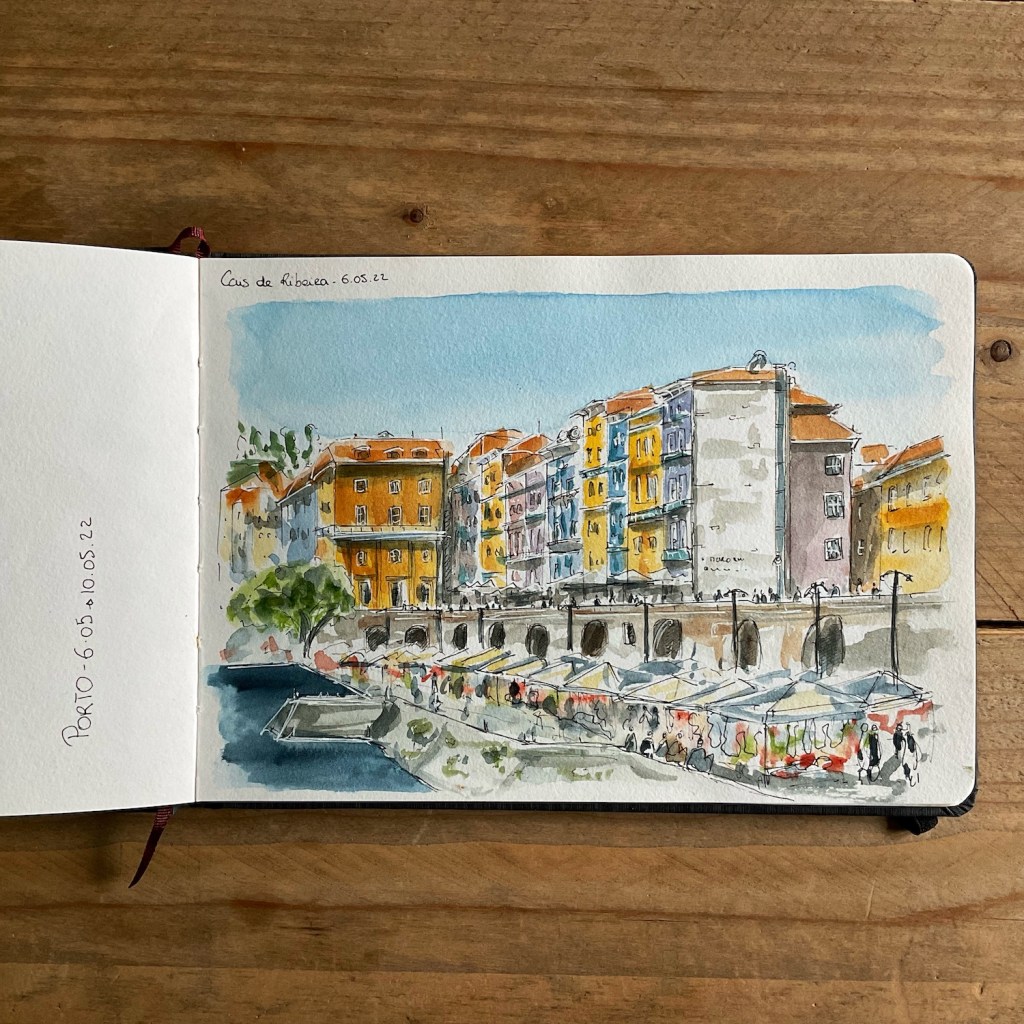 Au pied du pont Luis, à l’ombre, premier dessin de cette ville vibrante et colorée: une vue de la rue et du marché qui s’y trouve.