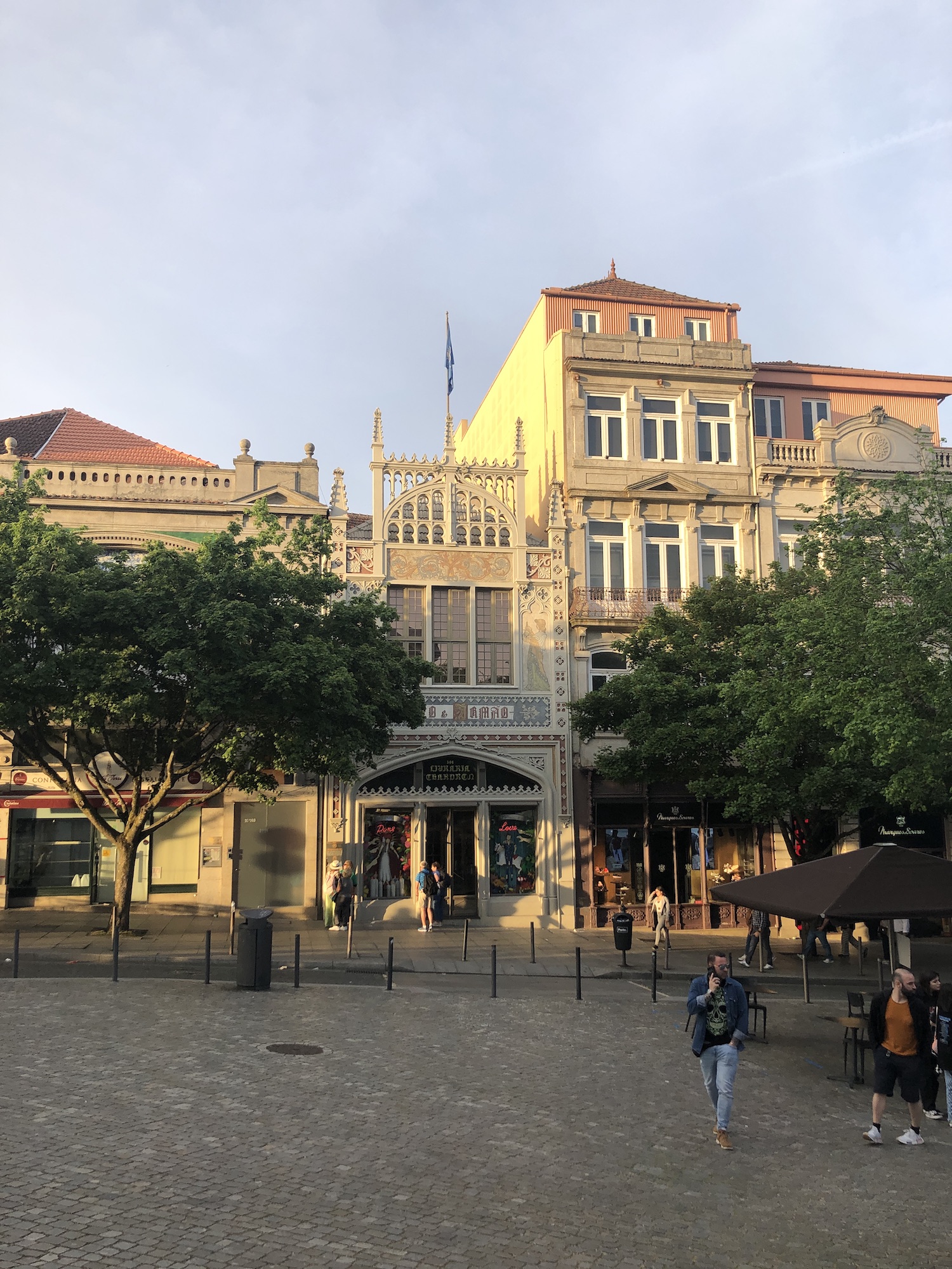 Nous arrivons sur une petite place verdoyante, où de nombreux locaux et touristes se prélassent dans l’herbe. Il fait déjà bien chaud en ce début de mois de main. C’est la place de l’enfant Dom Henrique, qui est dédiée au prince du même nom, représenté par une statue gigantesque. Le marché Ferreira Bordes, recouvert d’une couleur rouge criarde, est mon prochain sujet.
