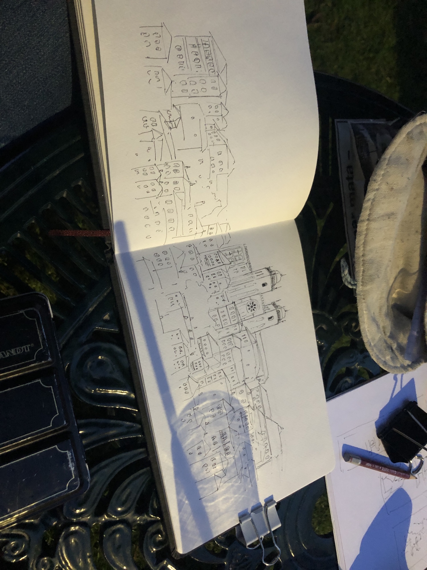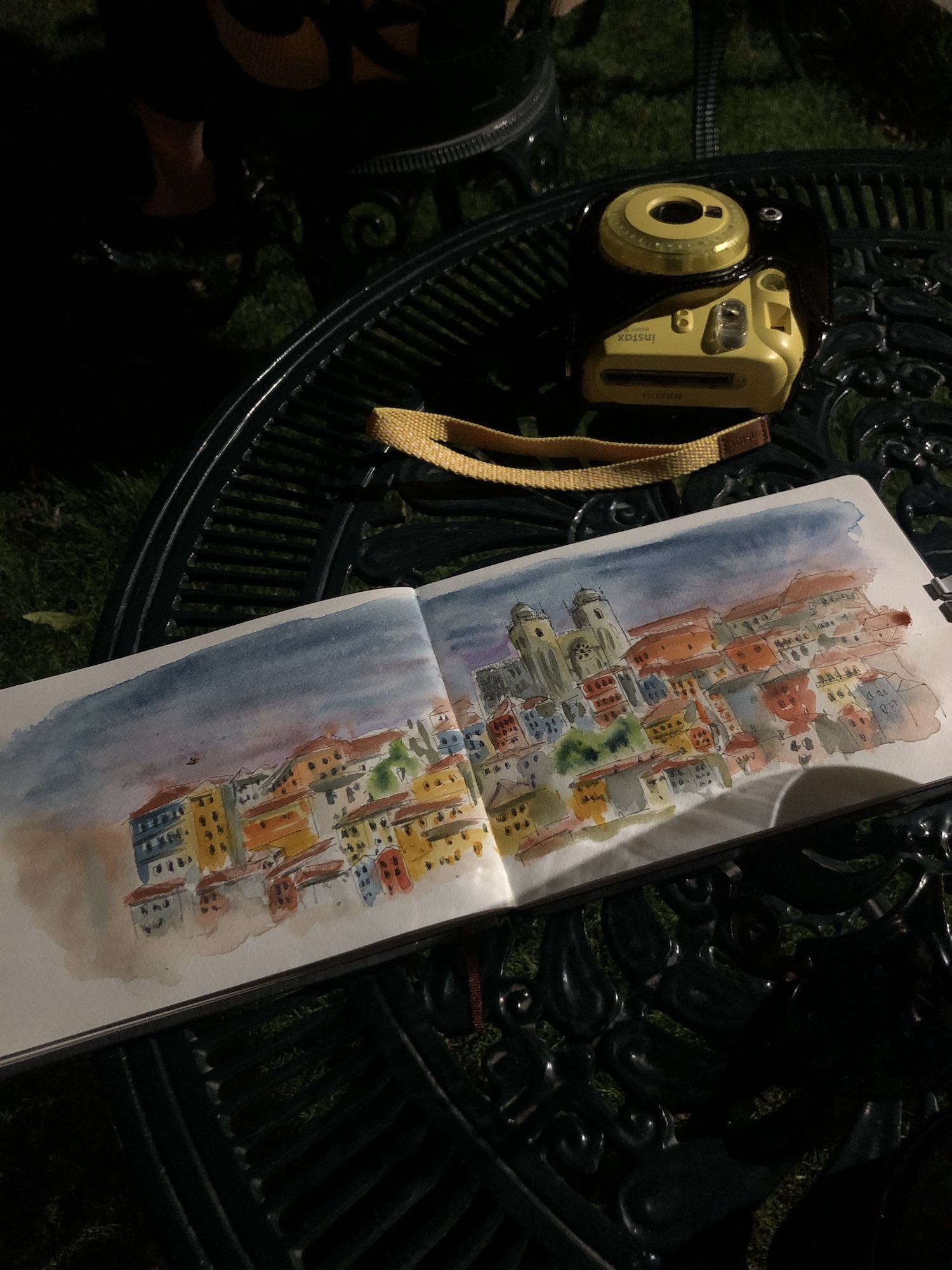 Nous nous installons sur une terrasse trouvée par hasard et qui nous offre une vue à 360 de la ville, et du coucher de soleil ! C’est parti pour un dernier dessin de la journée, terminé dans le noir complet (mais accompagné d’un verre de vin !)