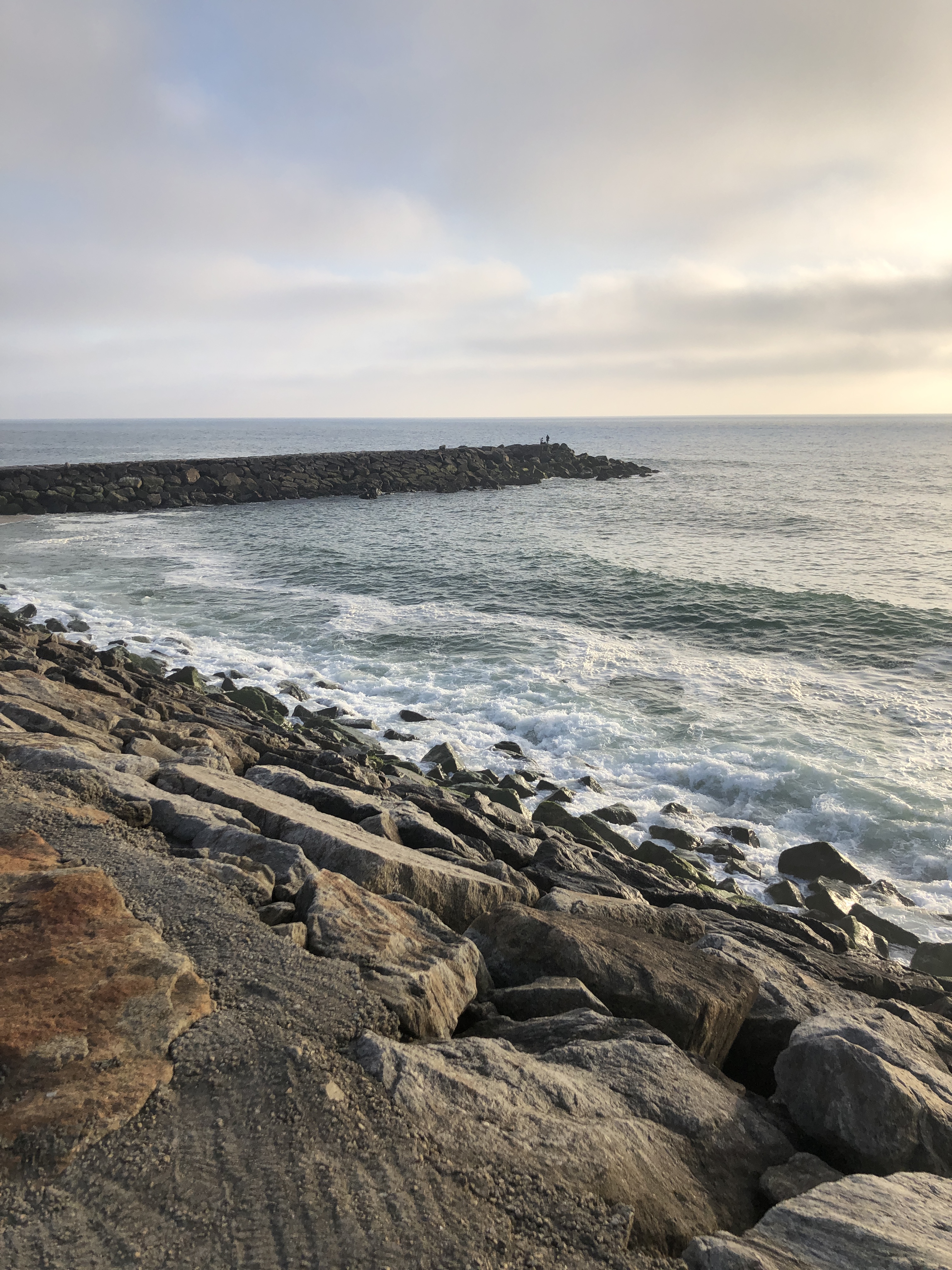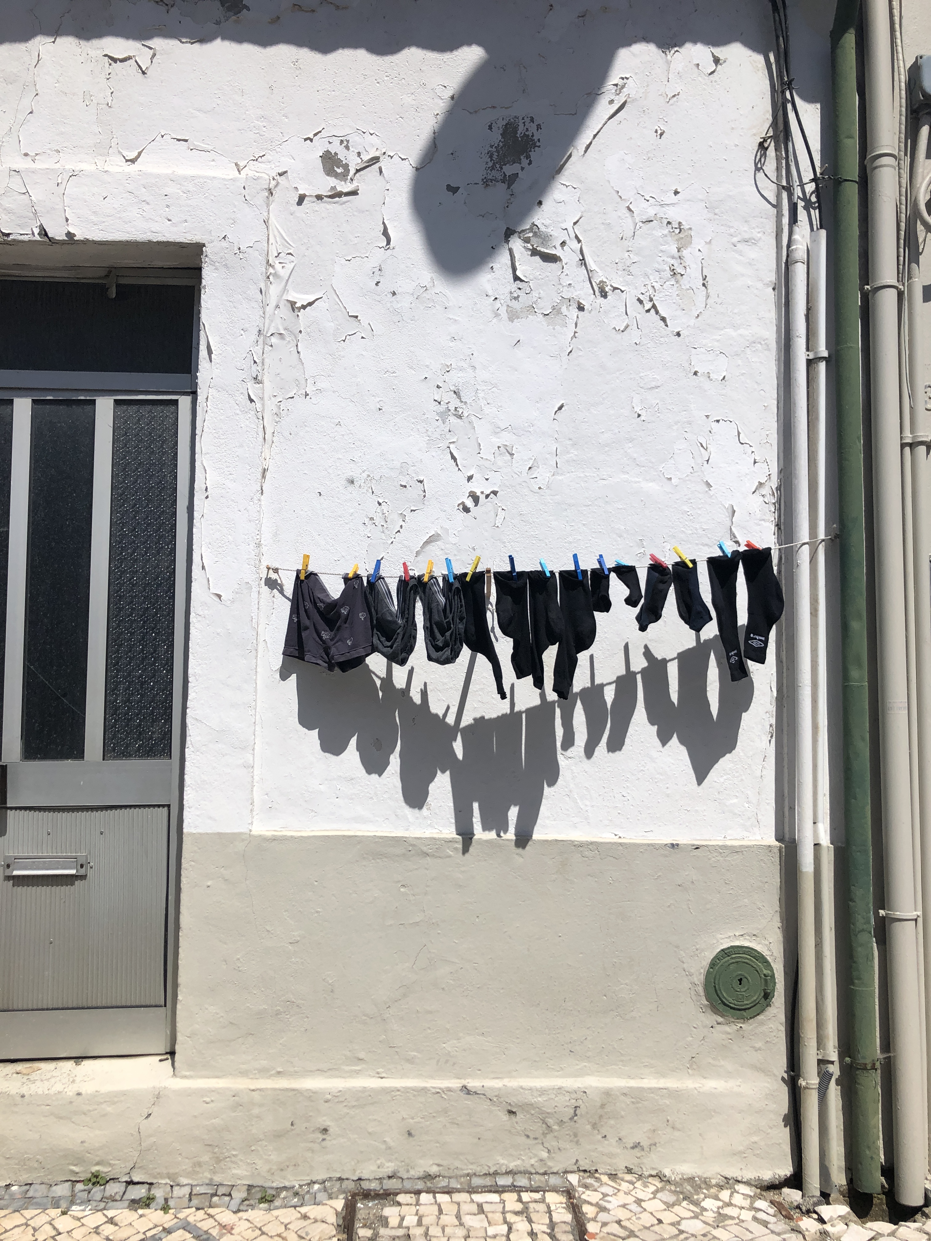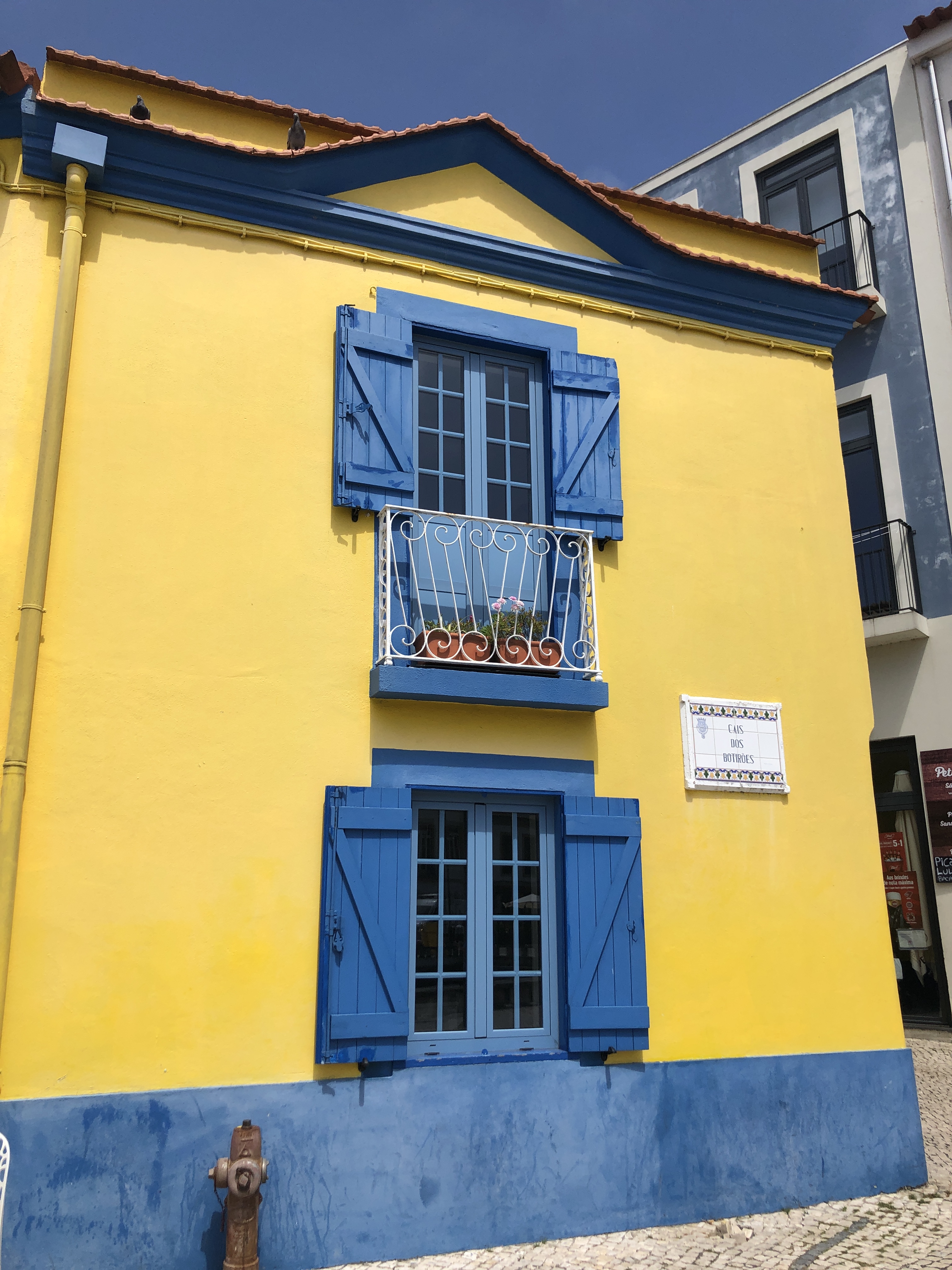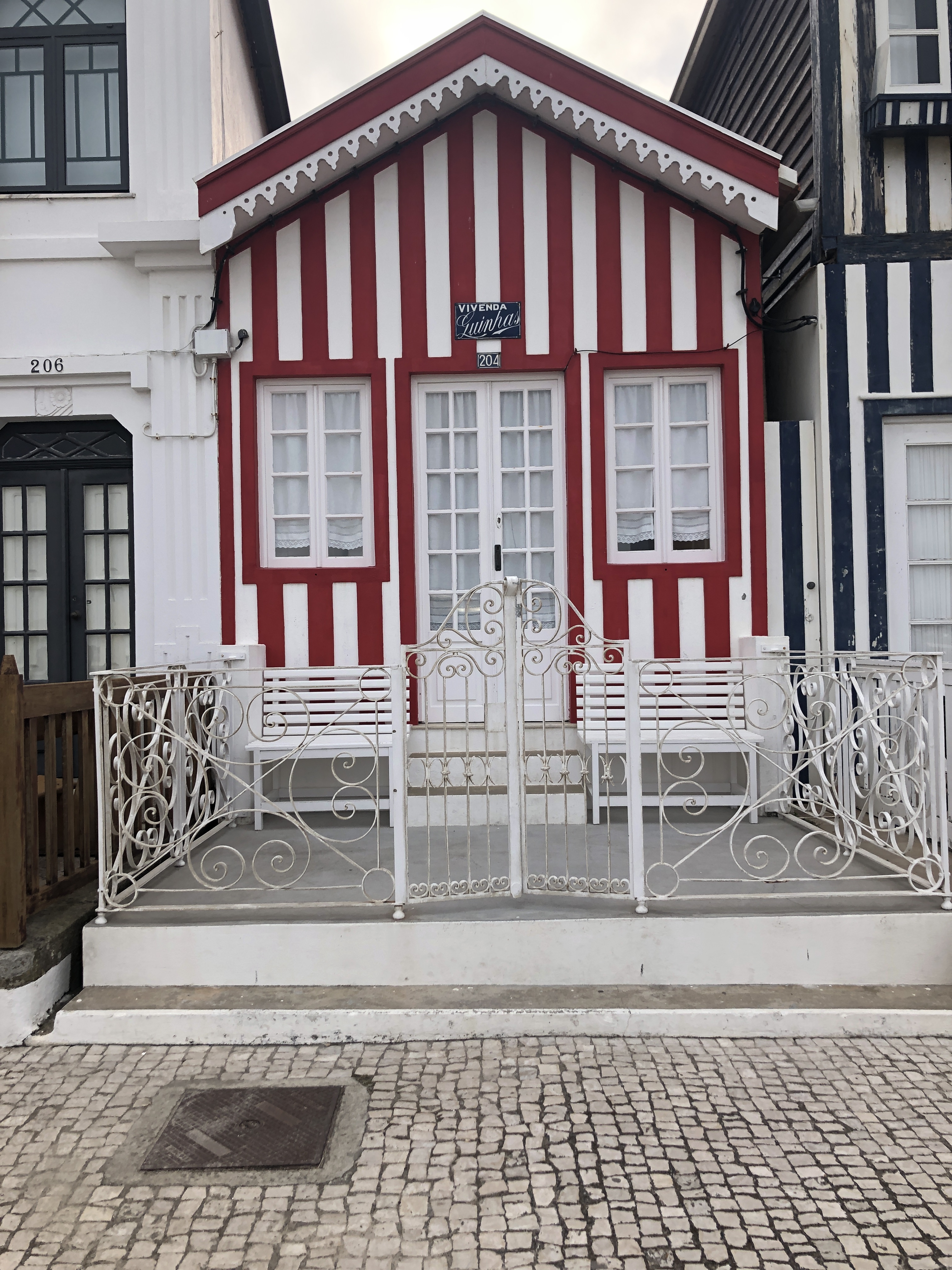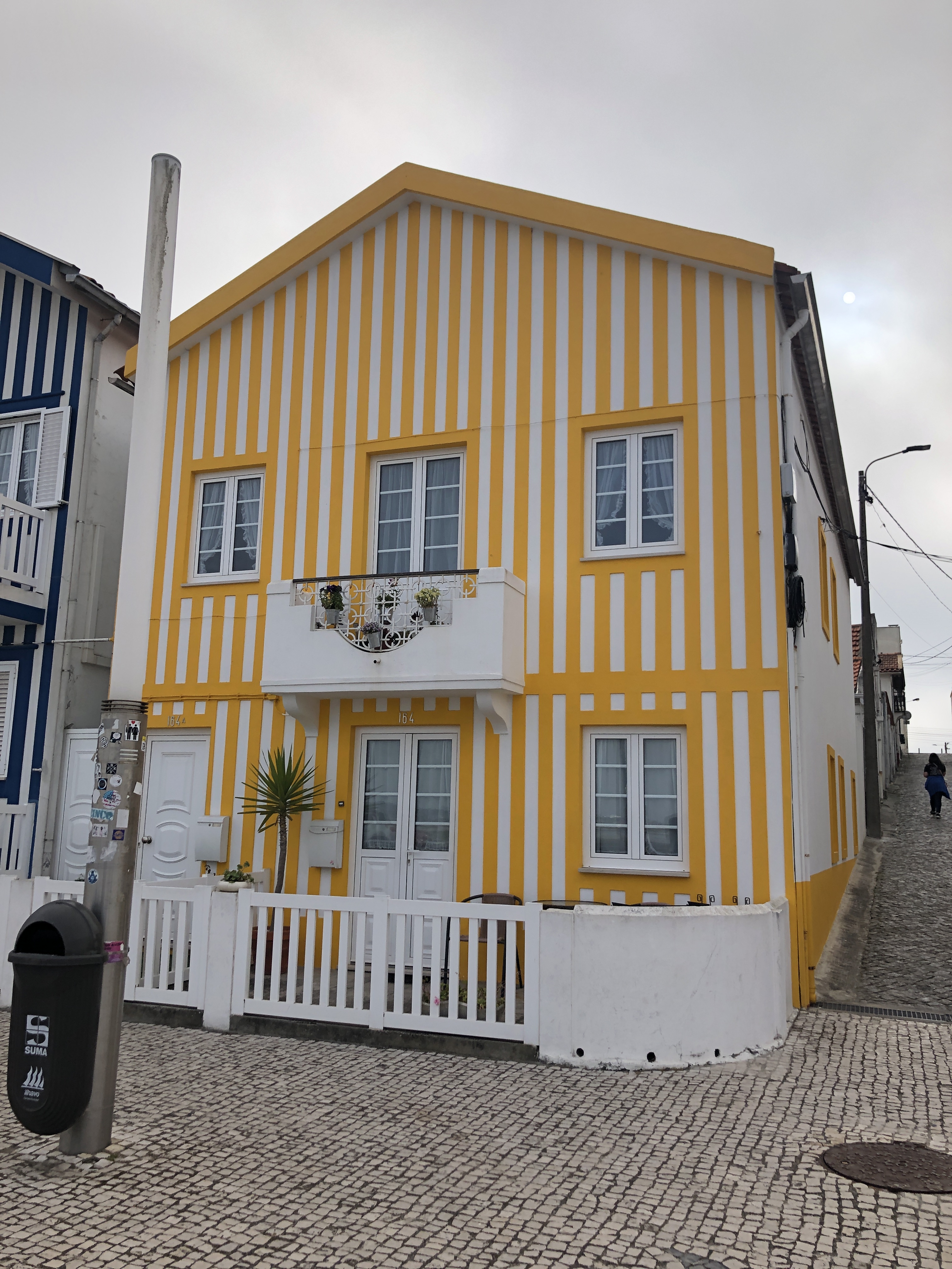 En fin de journée, nous nous arrêtons à Costa Nova, un village recommandée par des portugais rencontrés en route. Le ciel se couvre et l’ambiance est brumeuse. Des bus arrivent les uns après les autres et en descendent des retraités joyeux qui viennent se prendre en photo devant les maisons rayées, puis repartent.