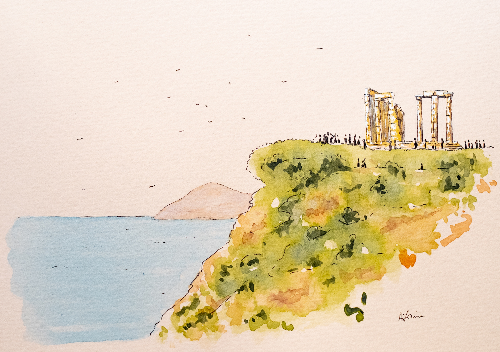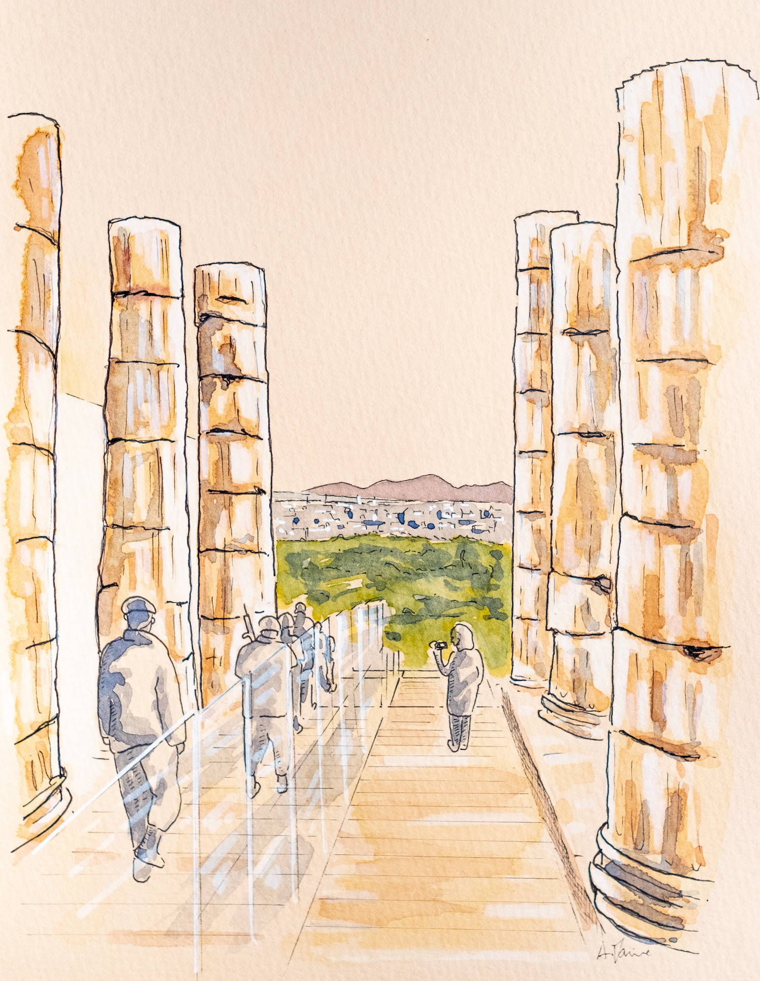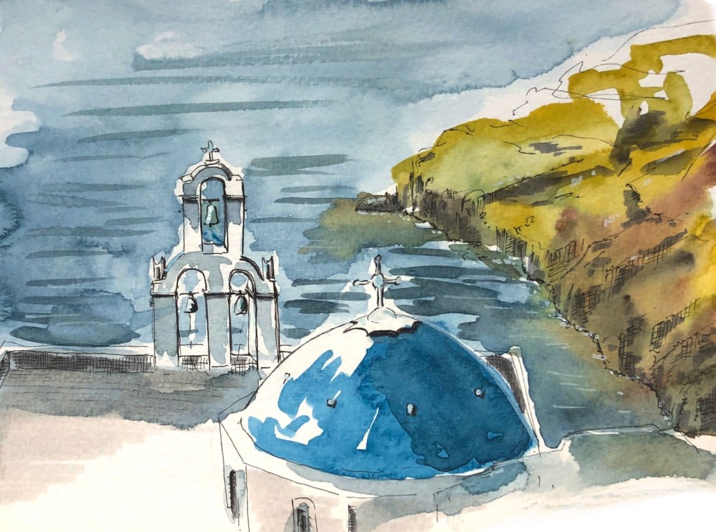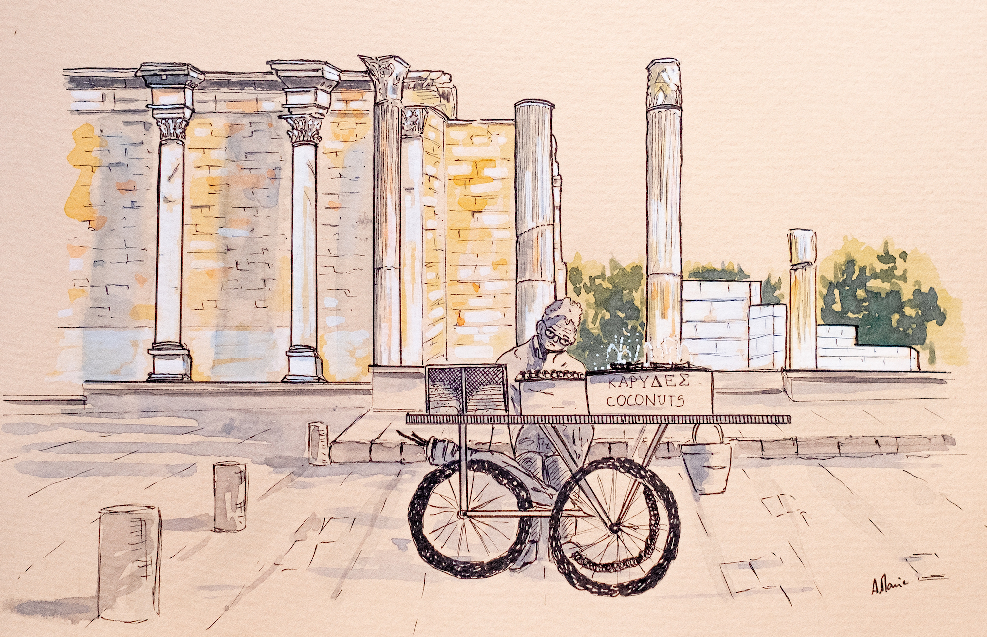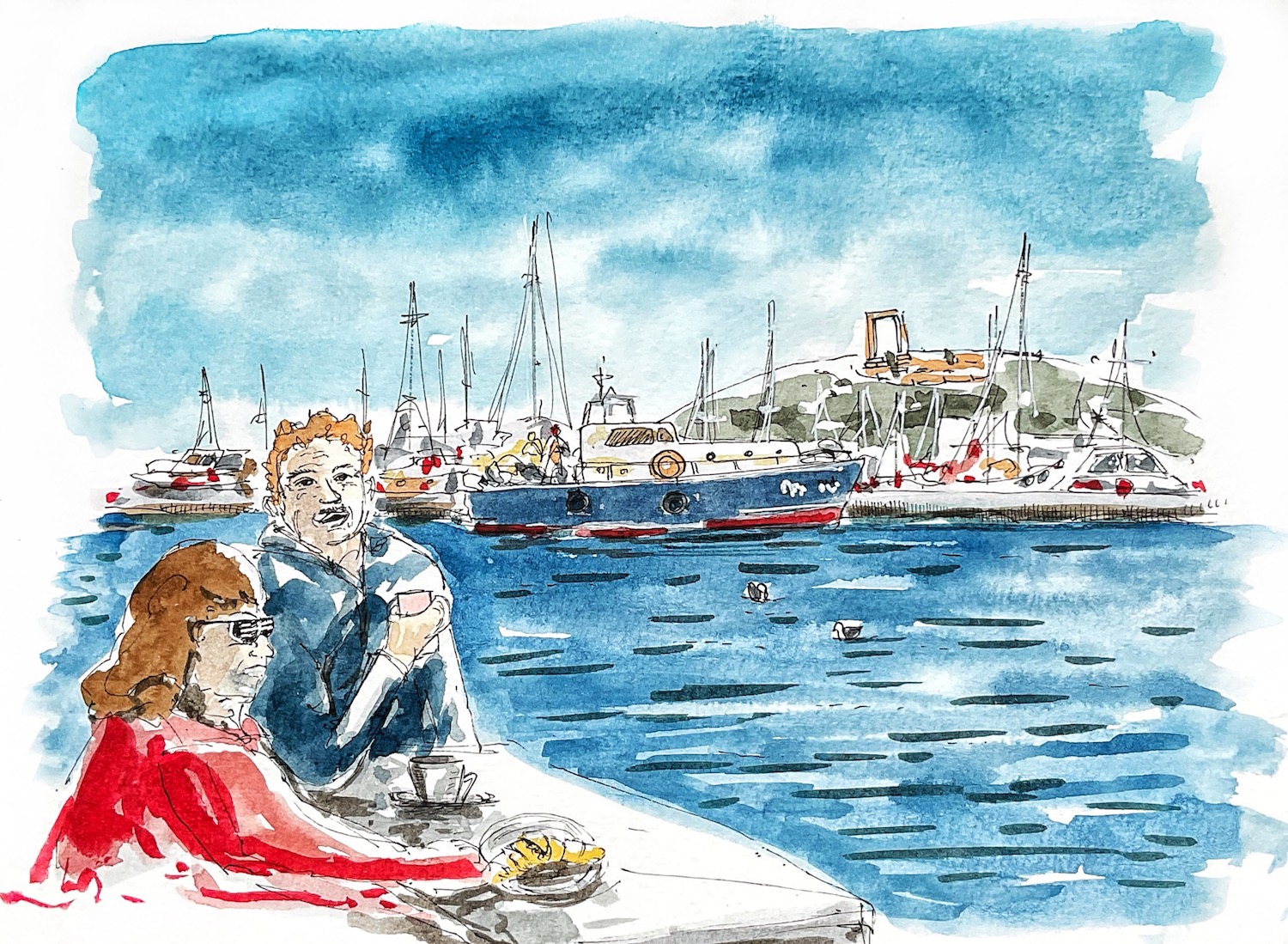 Nous nous installons sur une terrasse trouvée par hasard et qui nous offre une vue à 360 de la ville, et du coucher de soleil ! C’est parti pour un dernier dessin de la journée, terminé dans le noir complet (mais accompagné d’un verre de vin !)