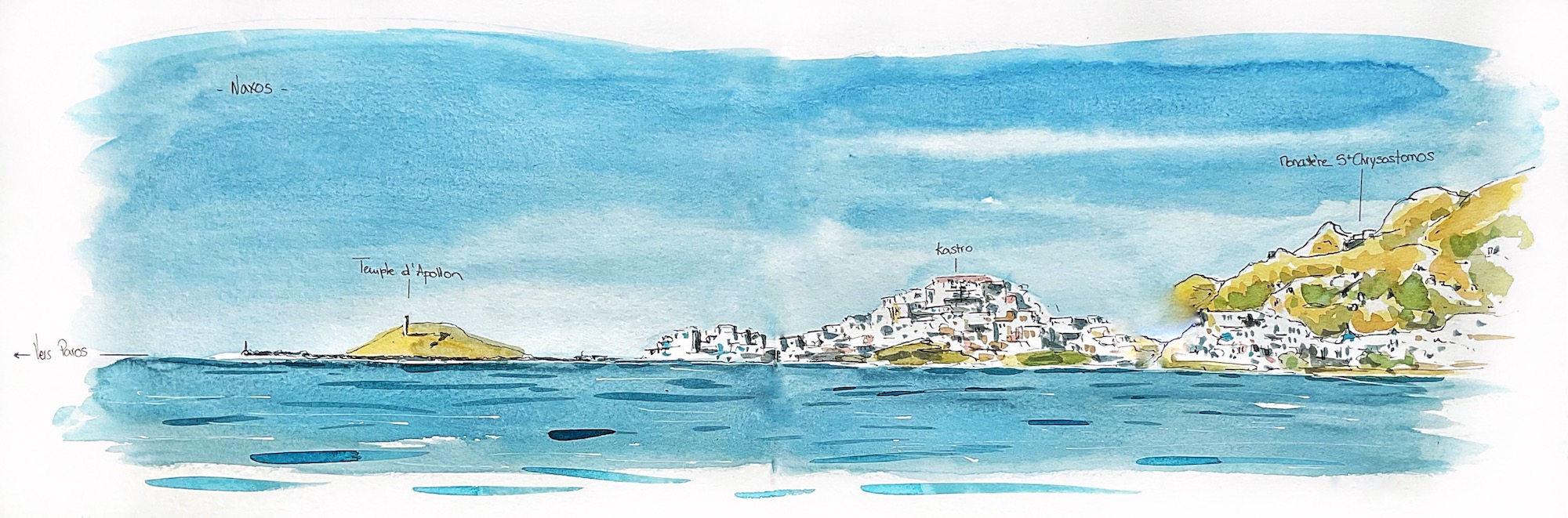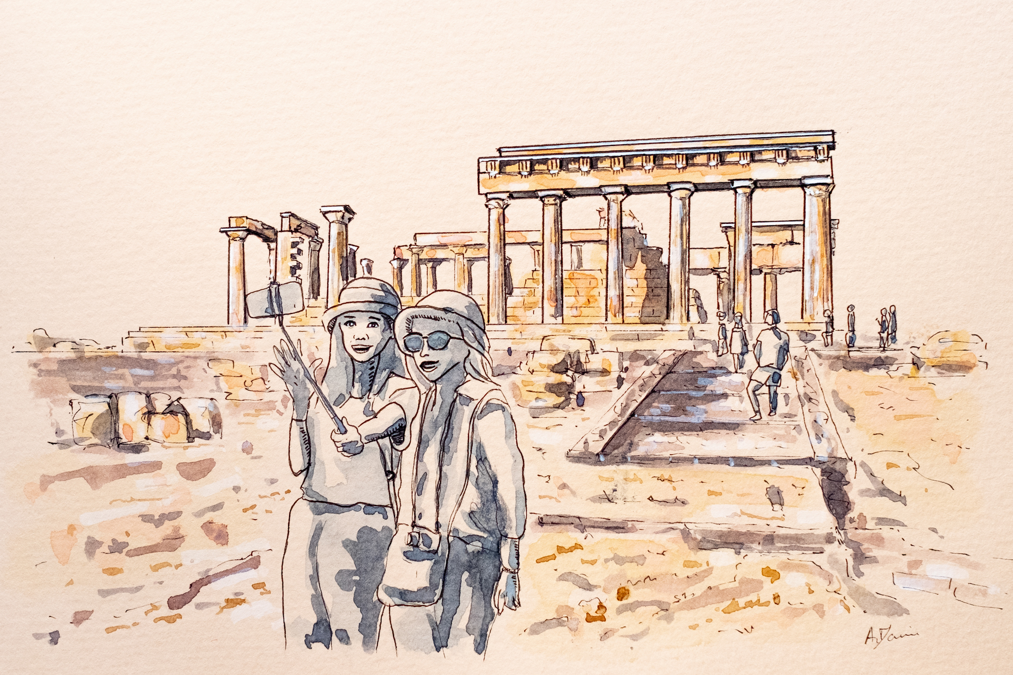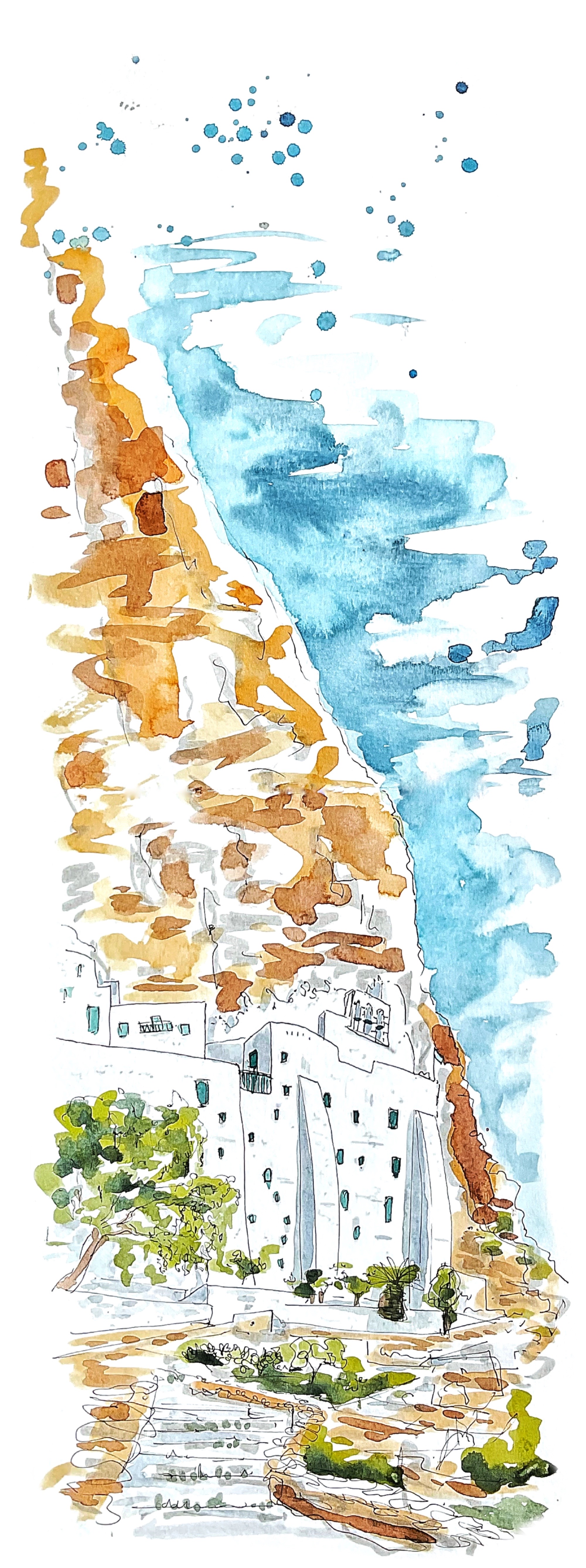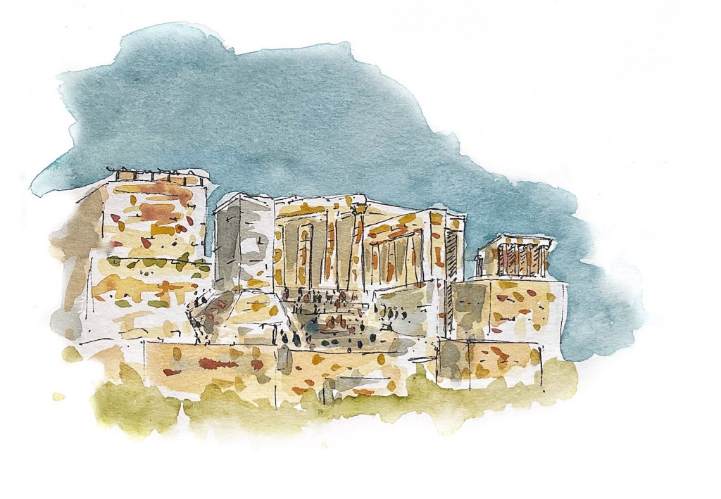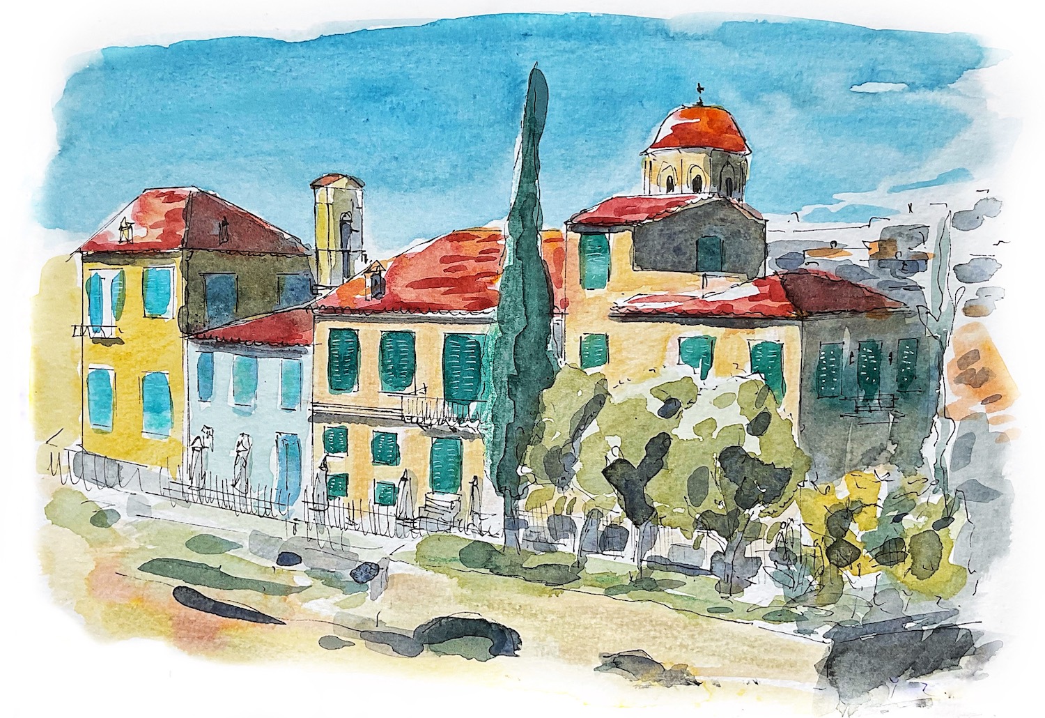 Nous nous installons sur une terrasse trouvée par hasard et qui nous offre une vue à 360 de la ville, et du coucher de soleil ! C’est parti pour un dernier dessin de la journée, terminé dans le noir complet (mais accompagné d’un verre de vin !)