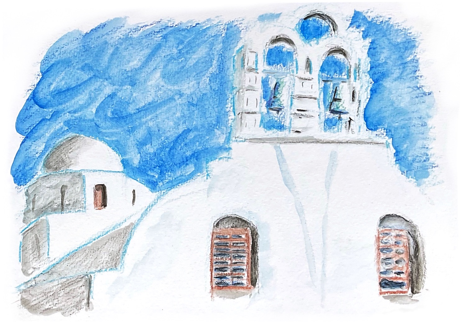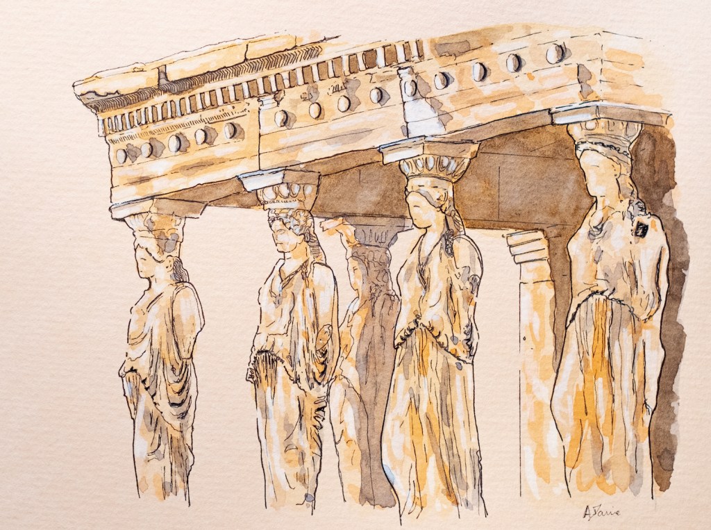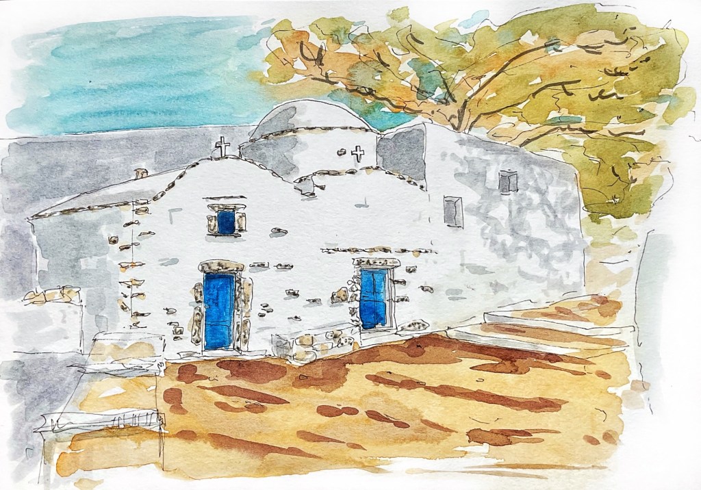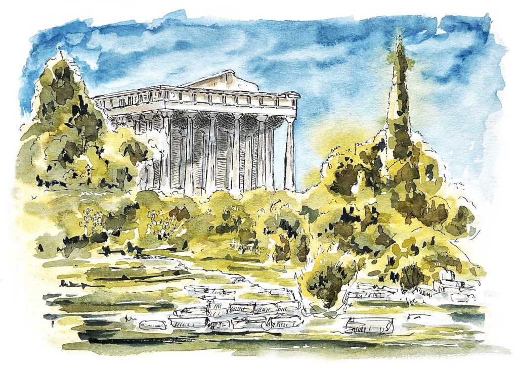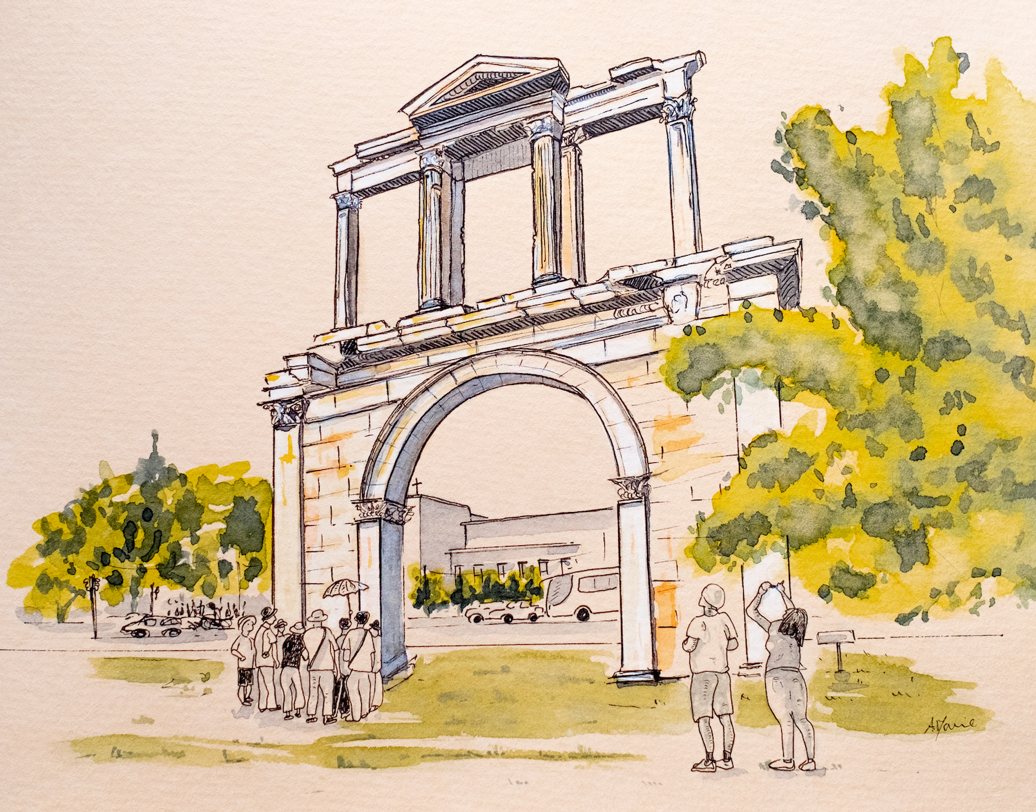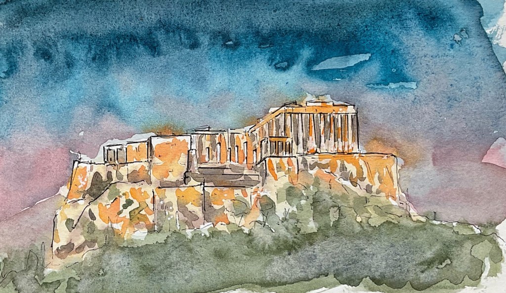 Nous nous installons sur une terrasse trouvée par hasard et qui nous offre une vue à 360 de la ville, et du coucher de soleil ! C’est parti pour un dernier dessin de la journée, terminé dans le noir complet (mais accompagné d’un verre de vin !)