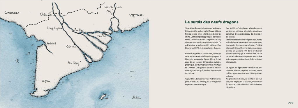 Sorti en 2022 aux Editions Intervalles, Mékong écoportrait est un livre-photo de Martin Bertrand. J’ai réalisé 9 cartes de zones géographiques à l’aquarelle et encre.